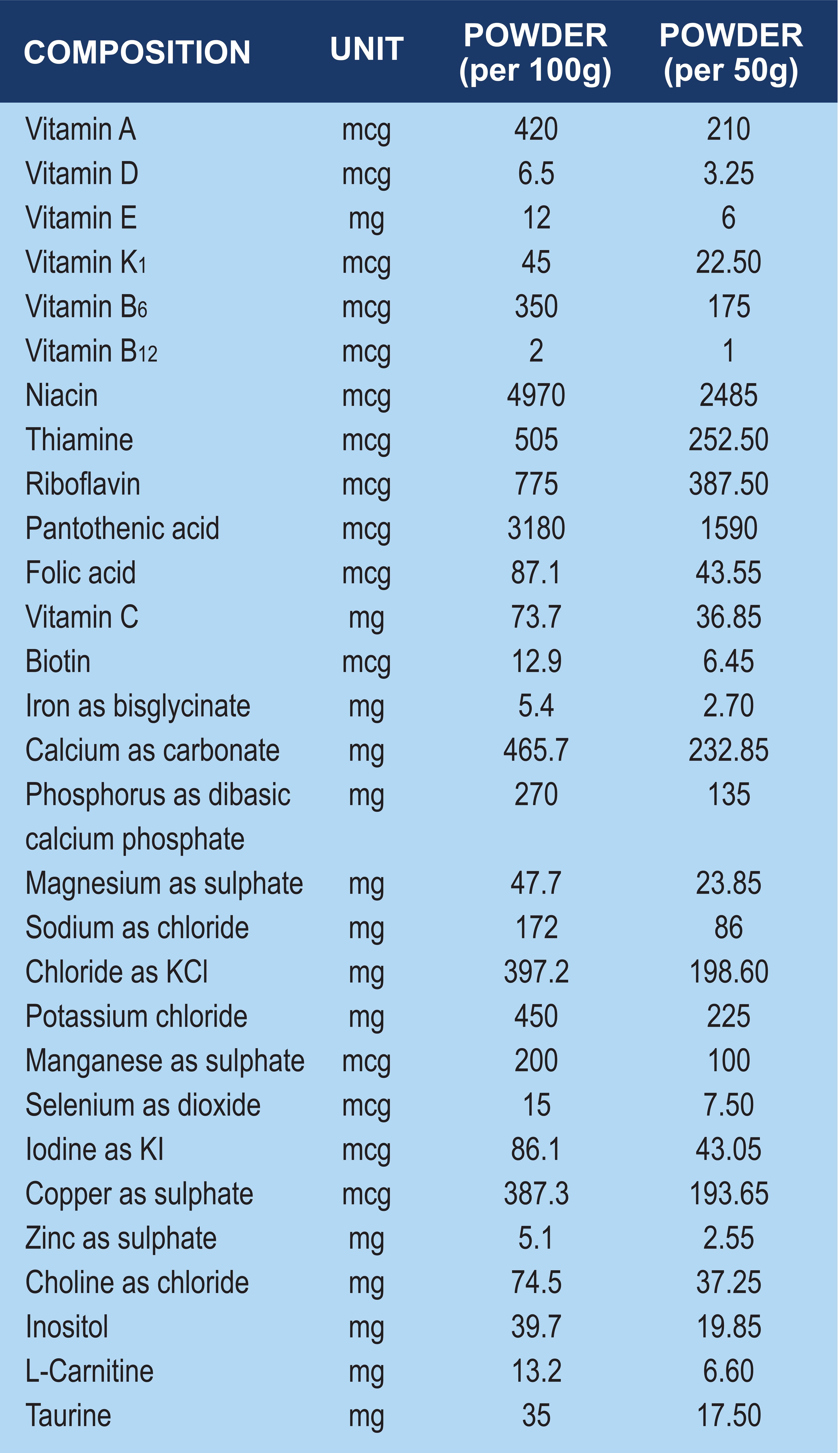 Skimmed milk powder, whole milk powder, milk protein concentrate, vegetable oils (high oleic sunflower seed oil, soybean oil, canola seed oil), corn syrup solids, fructo-oligosaccharides (FOS), flaxseed oil, taurine, l-carnitine, inositol, Vitamin A, Vitamin D3, alpha tocopheryl acetate, Vitamin K1, ascorbic acid, thiamine hydrochloride, Vitamin B2, niacin, Vitamin B6, folic acid, Vitamin B5, cyanocobalamin, biotin, iron bisglycinate, potassium iodide, calcium carbonate, dicalcium phosphate, magnesium sulphate, copper sulphate, zinc sulphate, manganese sulphate, sodium selenite, sodium chloride, potassium chloride, choline bitartrate, bifidobacterium longum, beta-D galactosidase, permitted flavorings.