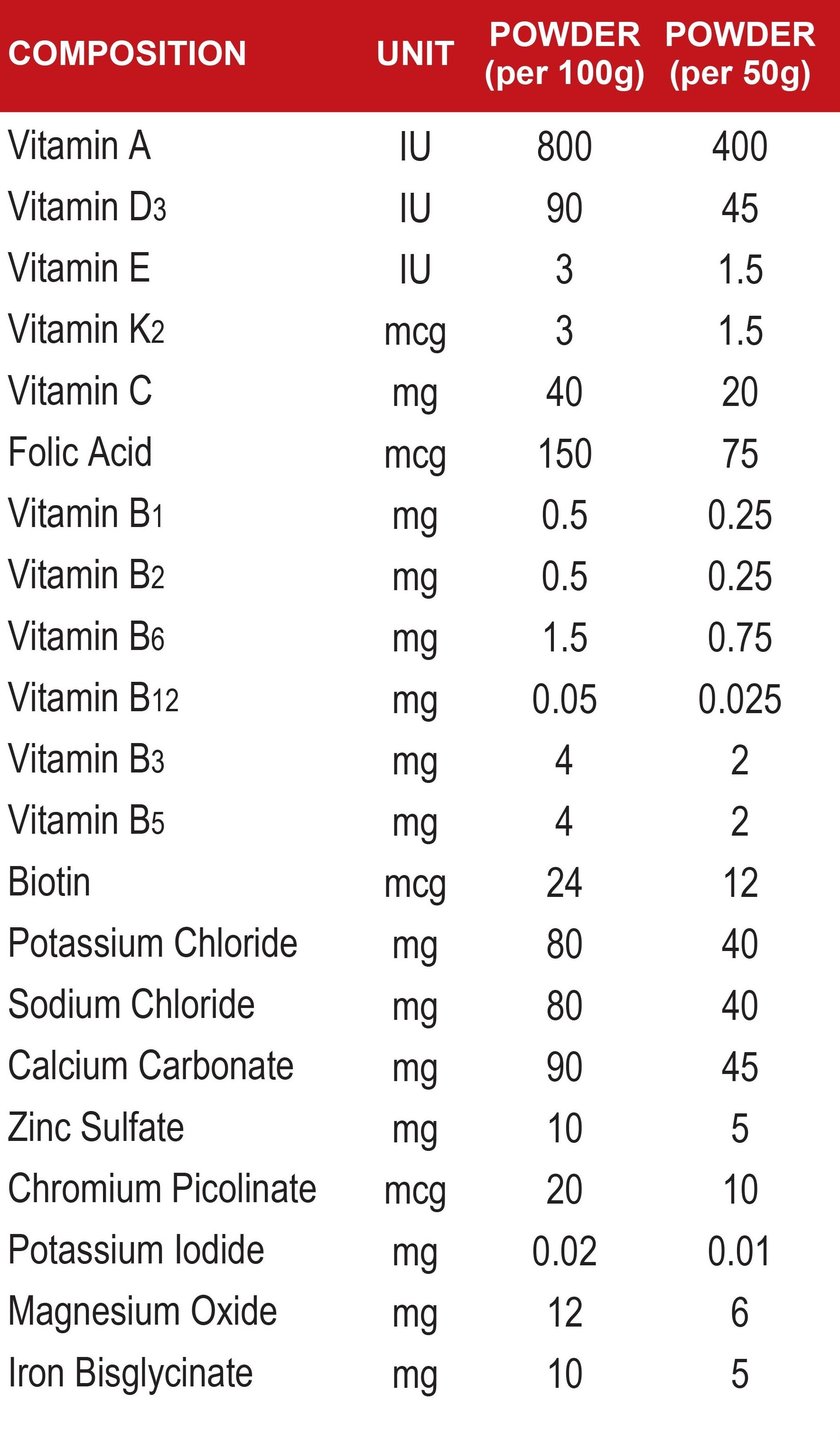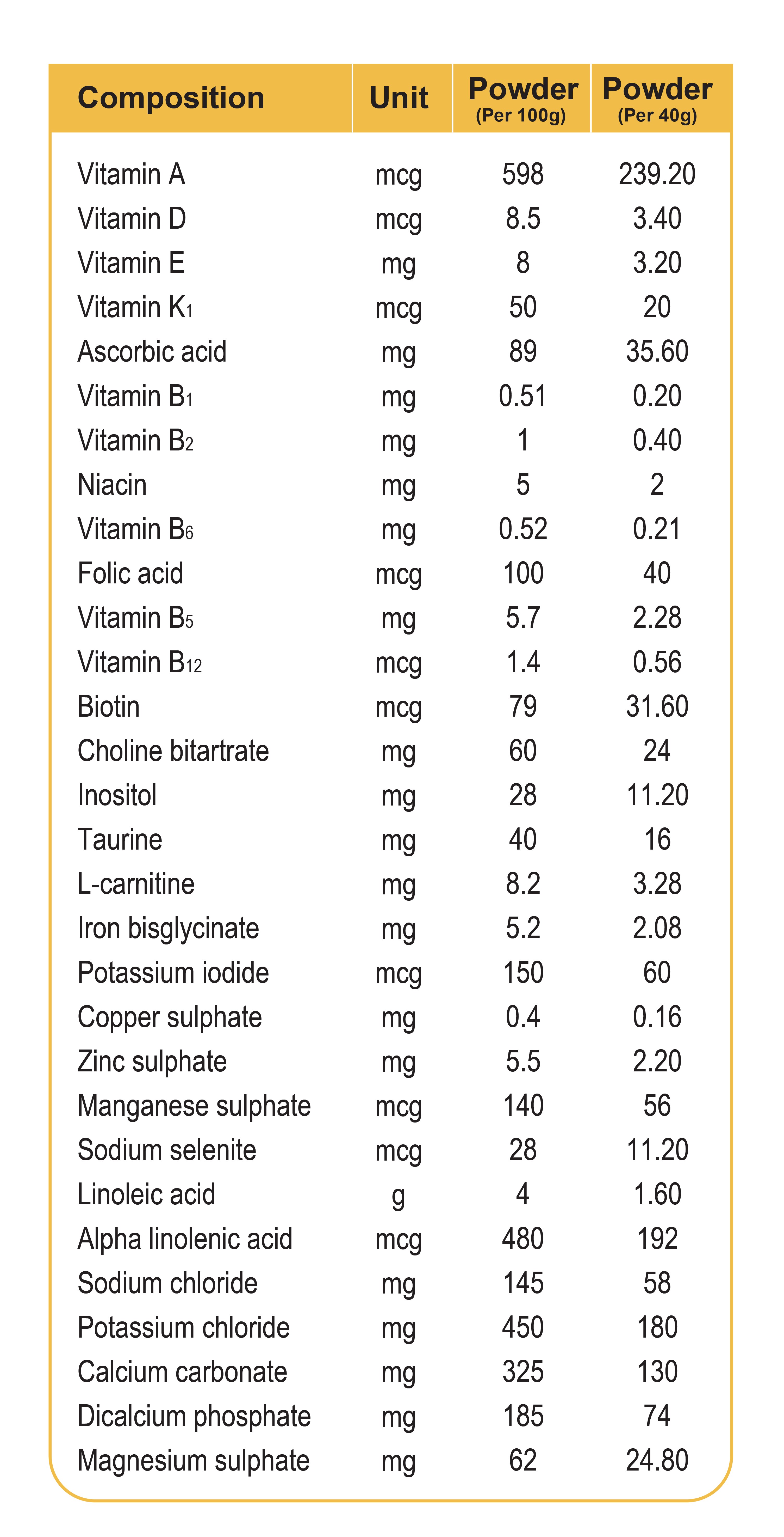 Skimmed milk powder, whole milk powder, milk protein concentrate, vegetable oils (high oleic sunflower seed oil, soybean oil, canola seed oil), corn syrup solids, fructo-oligosaccharides (FOS), flaxseed oil, taurine, l-carnitine, inositol, Vitamin A, Vitamin D3, alpha tocopheryl acetate, Vitamin K1, ascorbic acid, thiamine hydrochloride, Vitamin B2, niacin, Vitamin B6, folic acid, Vitamin B5, cyanocobalamin, biotin, iron bisglycinate, potassium iodide, calcium carbonate, dicalcium phosphate, magnesium sulphate, copper sulphate, zinc sulphate, manganese sulphate, sodium selenite, sodium chloride, potassium chloride, choline bitartrate, bifidobacterium longum, beta-D galactosidase, permitted flavorings.
